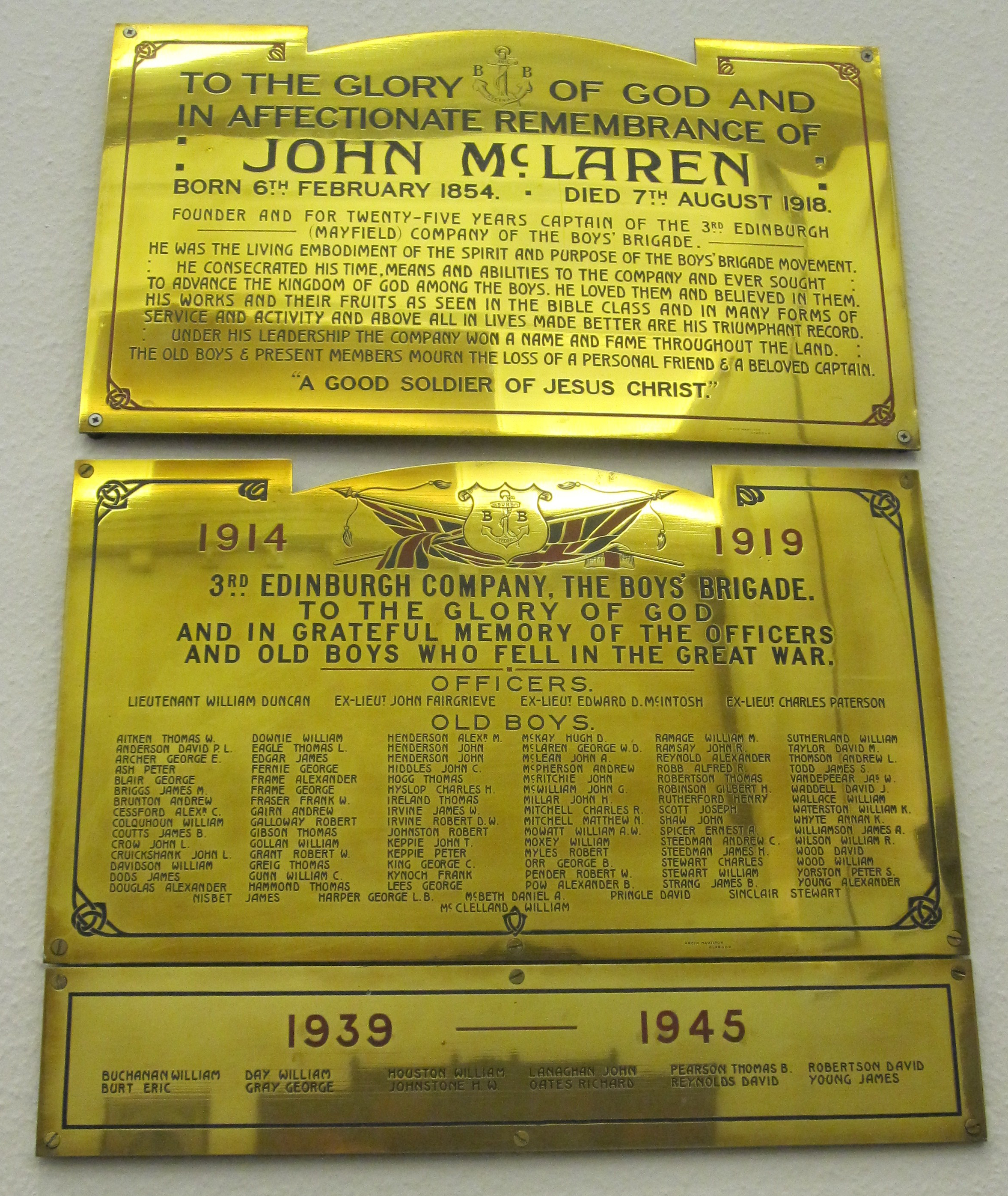 There is also one from 3rd Edinburgh Company Boys' Brigade which had strong links with Mayfield Church. Anyone with particular interest in the Boys' Brigade may also like to view the many photographs of members which were found in our church archives and can be seen here in the gallery on this site.