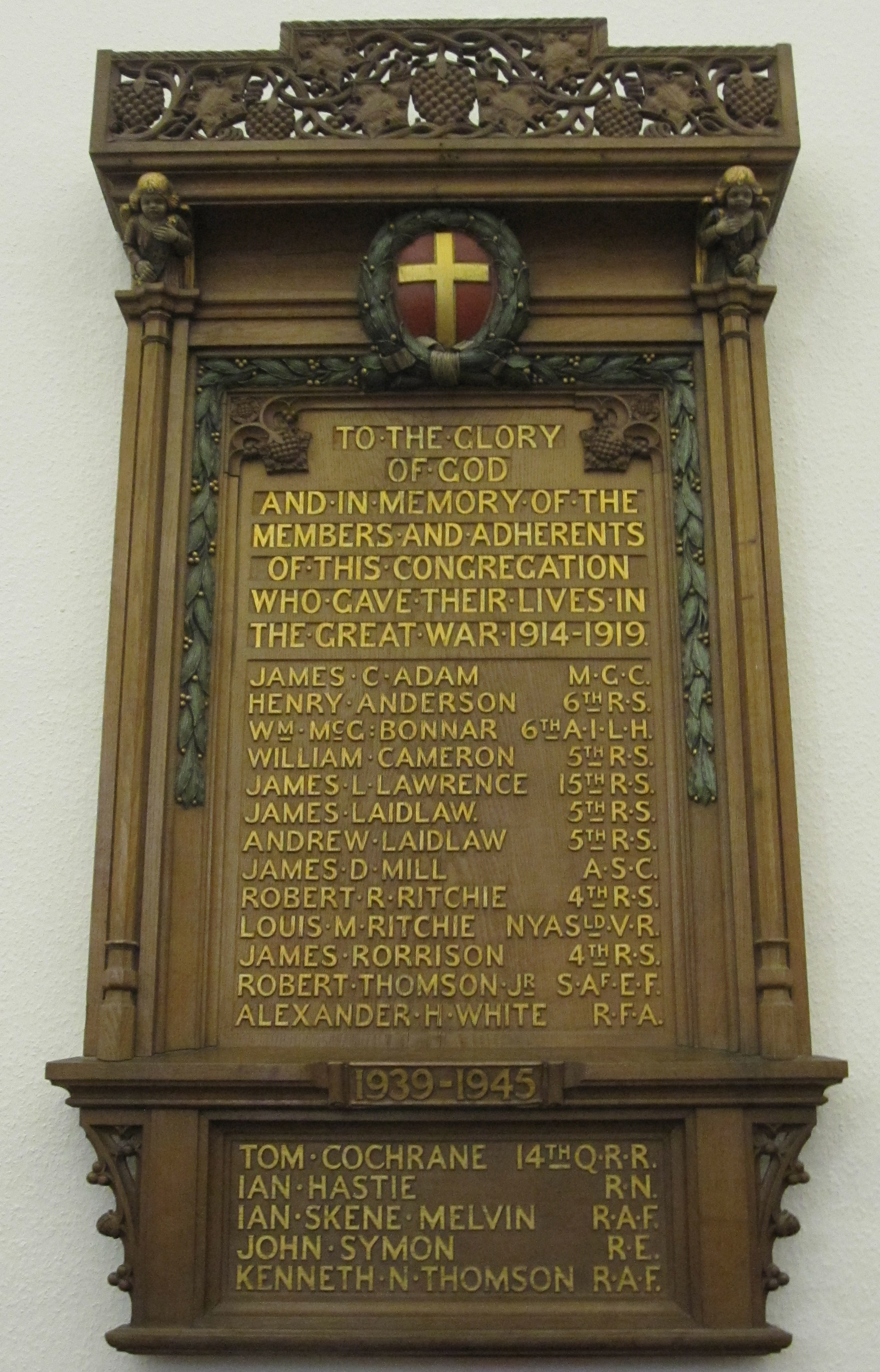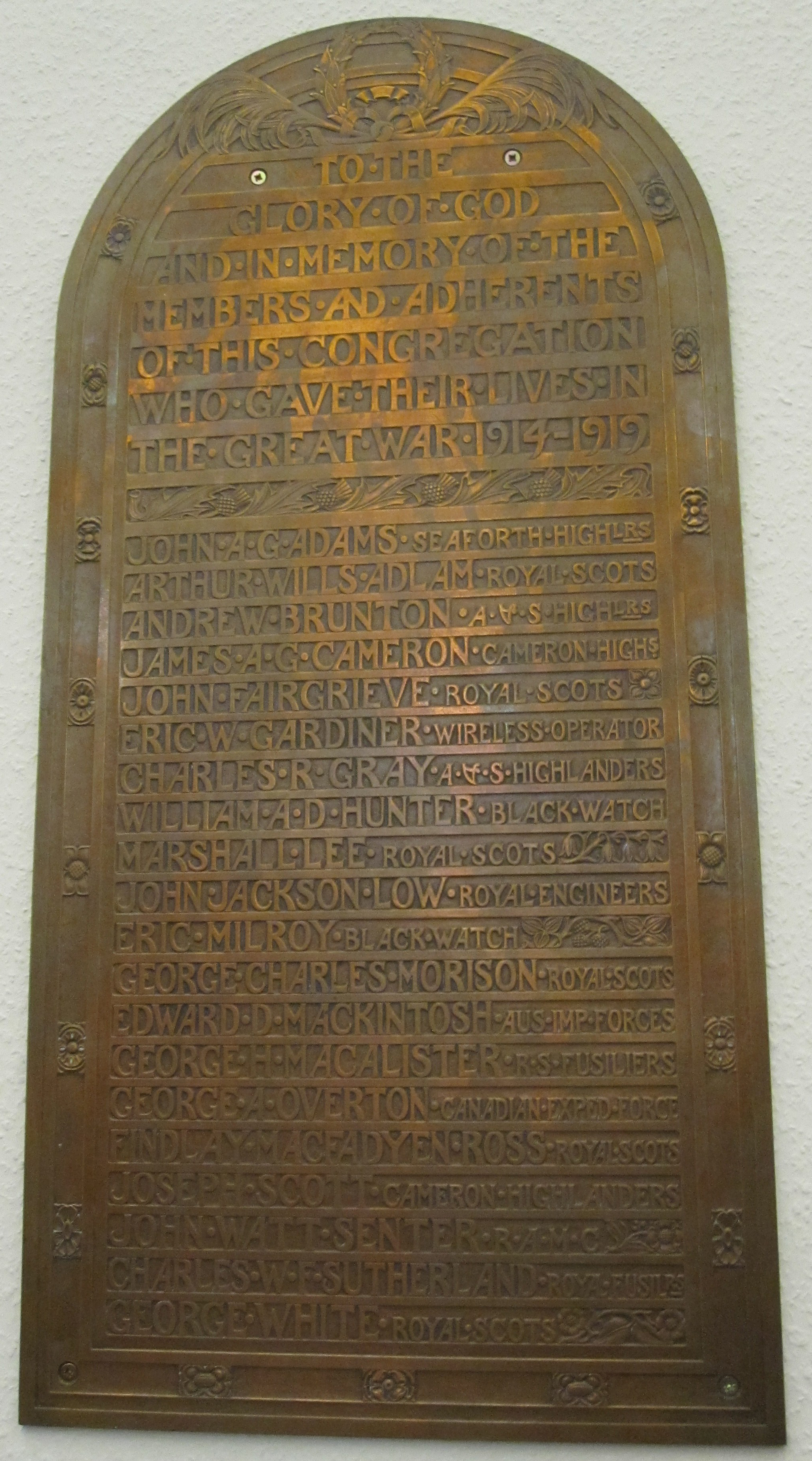 TO THE GLORY OF GOD AND IN MEMORY OF THE MEMBERS AND ADHERENTS OF THIS CONGREGATION WHO GAVE THEIR LIVES IN THE GREAT WAR 1914 - 1919