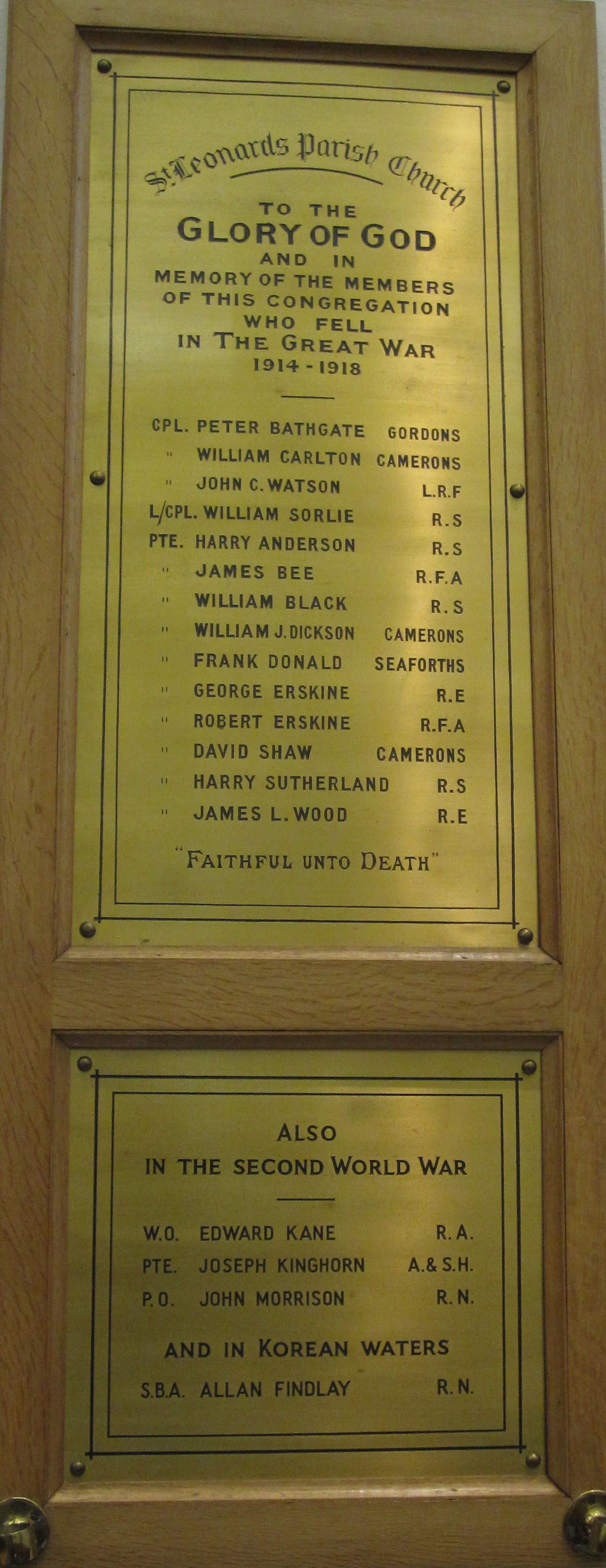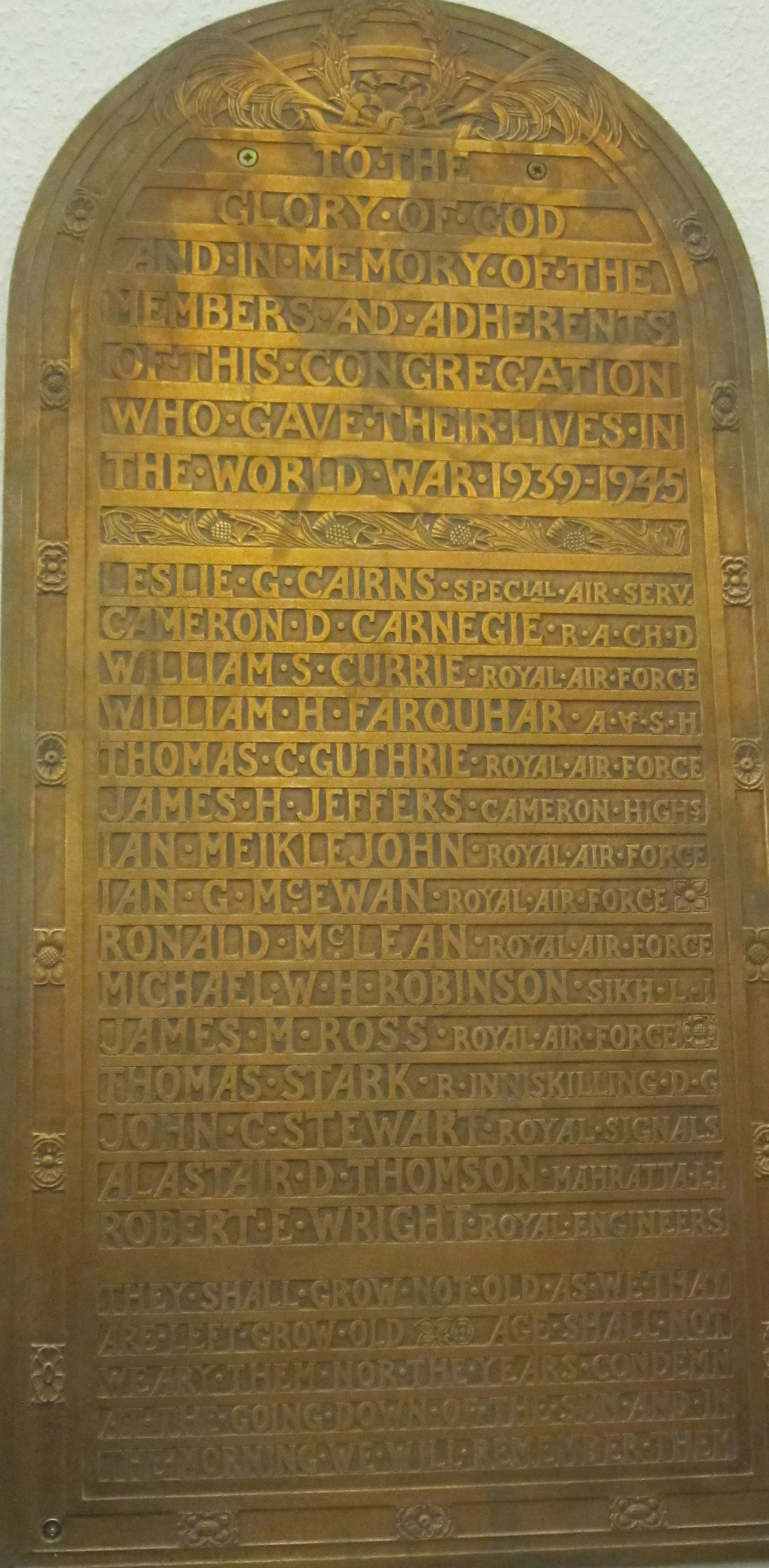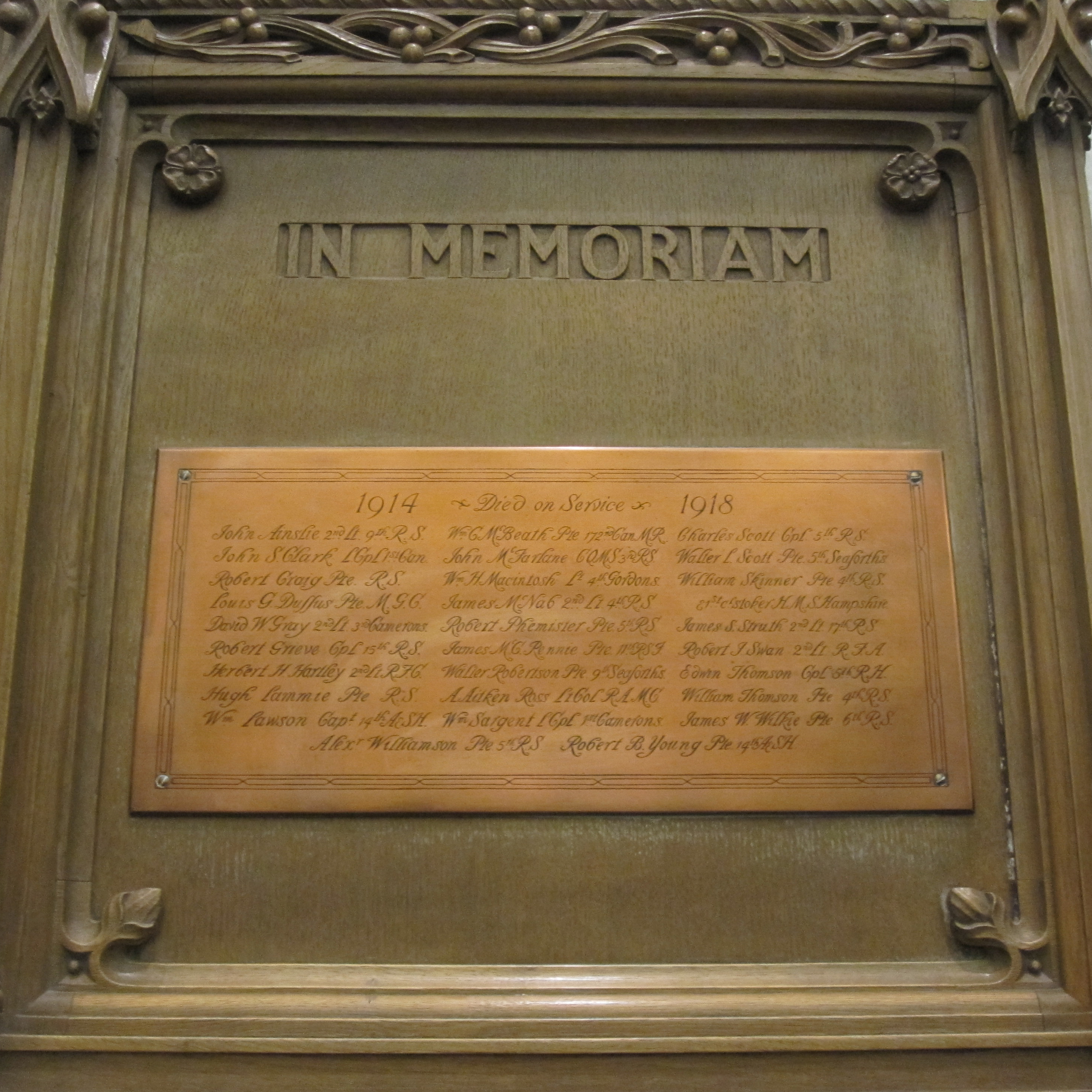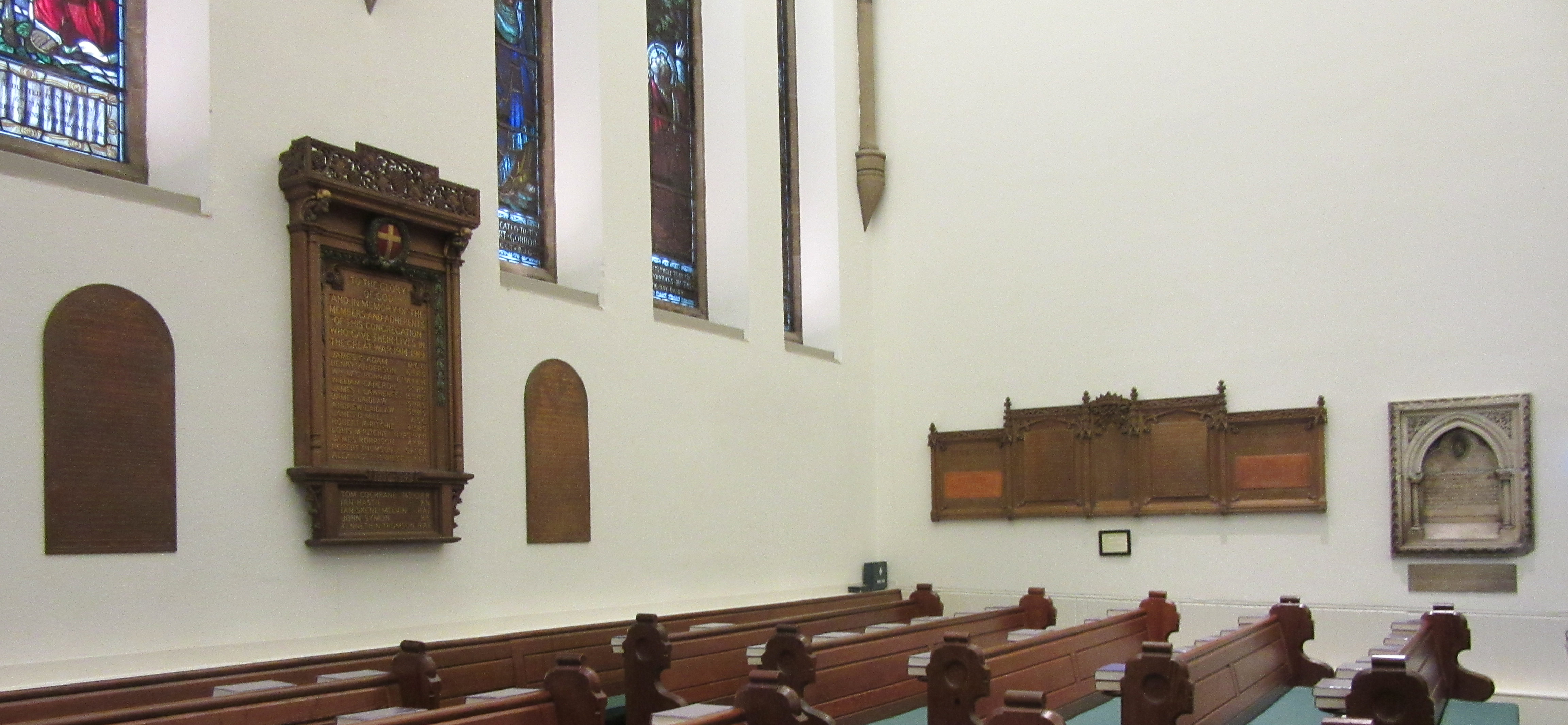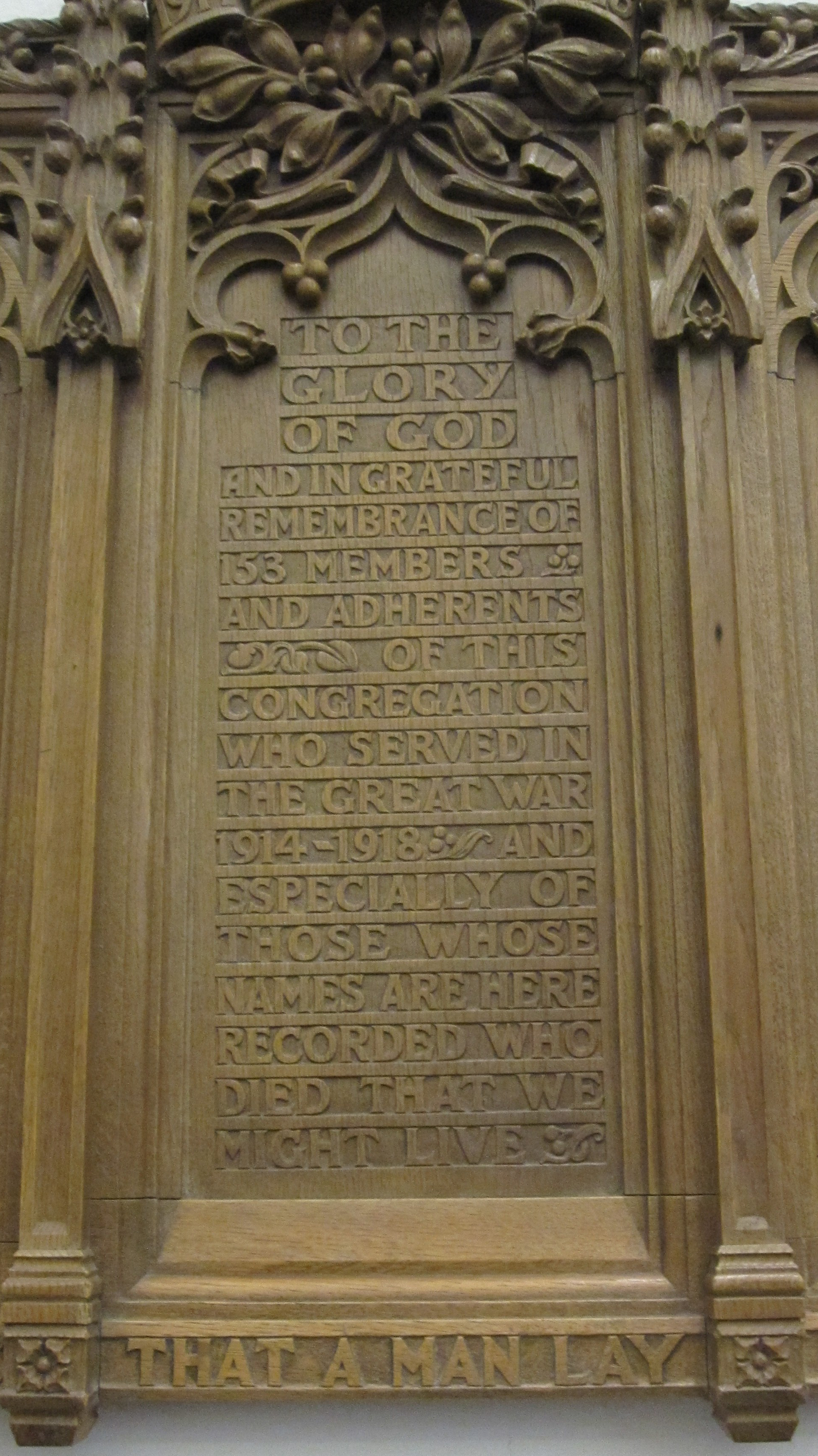 To the Glory of God and in grateful remembrance of 153 members and adherents of this Congregation who served in the Great War 1914 – 1918 and especially of those whose names are here recorded who died that we might live.